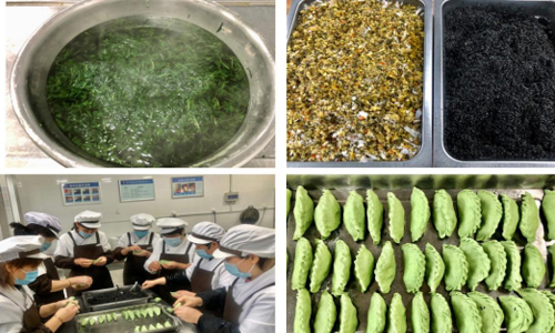 学院食堂的阿姨们,正将泛着青香的鲜嫩艾叶汁倒入米粉和匀作皮,包入白糖芝麻或笋丝咸菜馅儿,捏成海燕状饺子,上锅蒸20分钟,一只只软软糯糯、晶晶亮亮的艾饺就制作完成了,用香甜清新的味道传递春天的气息,装扮青青校园的春色。