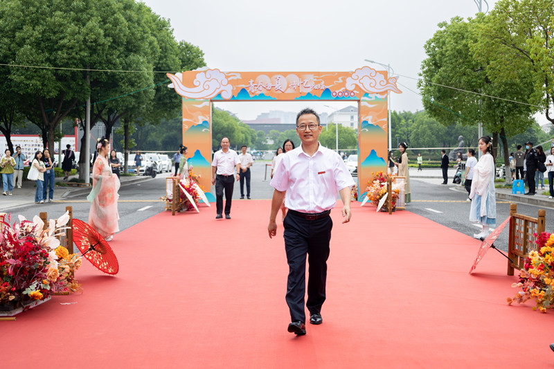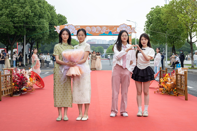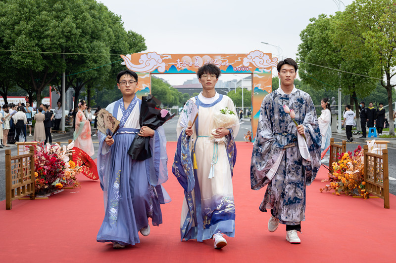 元培大道,百米红毯,花团锦簇。国际文化交流中心前,欢声笑语,氛围浓烈。在主持人的介绍下,毕业生与师长、同学、亲朋好友共同踏上这条寓意新征程的红毯,完成了人生中第一次“红毯秀”。他们或身着古色古香的汉服,或拿着明艳的鲜花,或手持素雅的纸扇,时而带着笑容招手,时而互相寒暄打趣。电商1902班金忠行从进校起就参与到了每年的红毯筹备,今年是他参与红毯礼的第四年,“走完这趟红毯,也就意味着我正式走向人生的另一段旅程。”优秀毕业生代表传播1901班杨倩激动地说:“走红毯既是荣誉的象征,也是对我们四年学习生涯的肯定,今天的我们走过了人生中最重要的一次红毯秀。”计算机1903班潘佳宇与妈妈一起参加了红毯礼,“女儿的大学四年是独立的四年,很荣幸能够参与陪伴她走完大学的最后一程。”